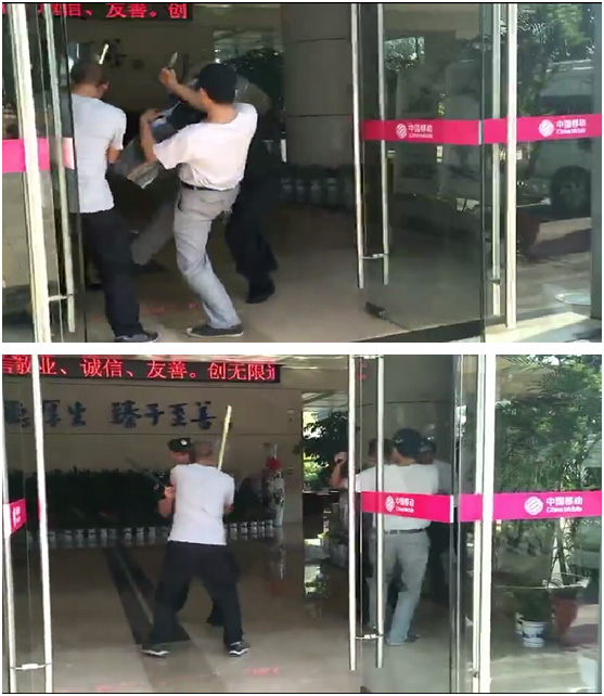 恐怖分子拿出随身携带的斧子准备硬闯入移动大楼,消控室消控员看到监控画面上的恐怖分子,立刻用对讲机呼叫:有恐怖分子闯入,请各部门注意。安防副主管立即组织保安人员拿起盾牌、钢叉等防暴工具奔赴现场。